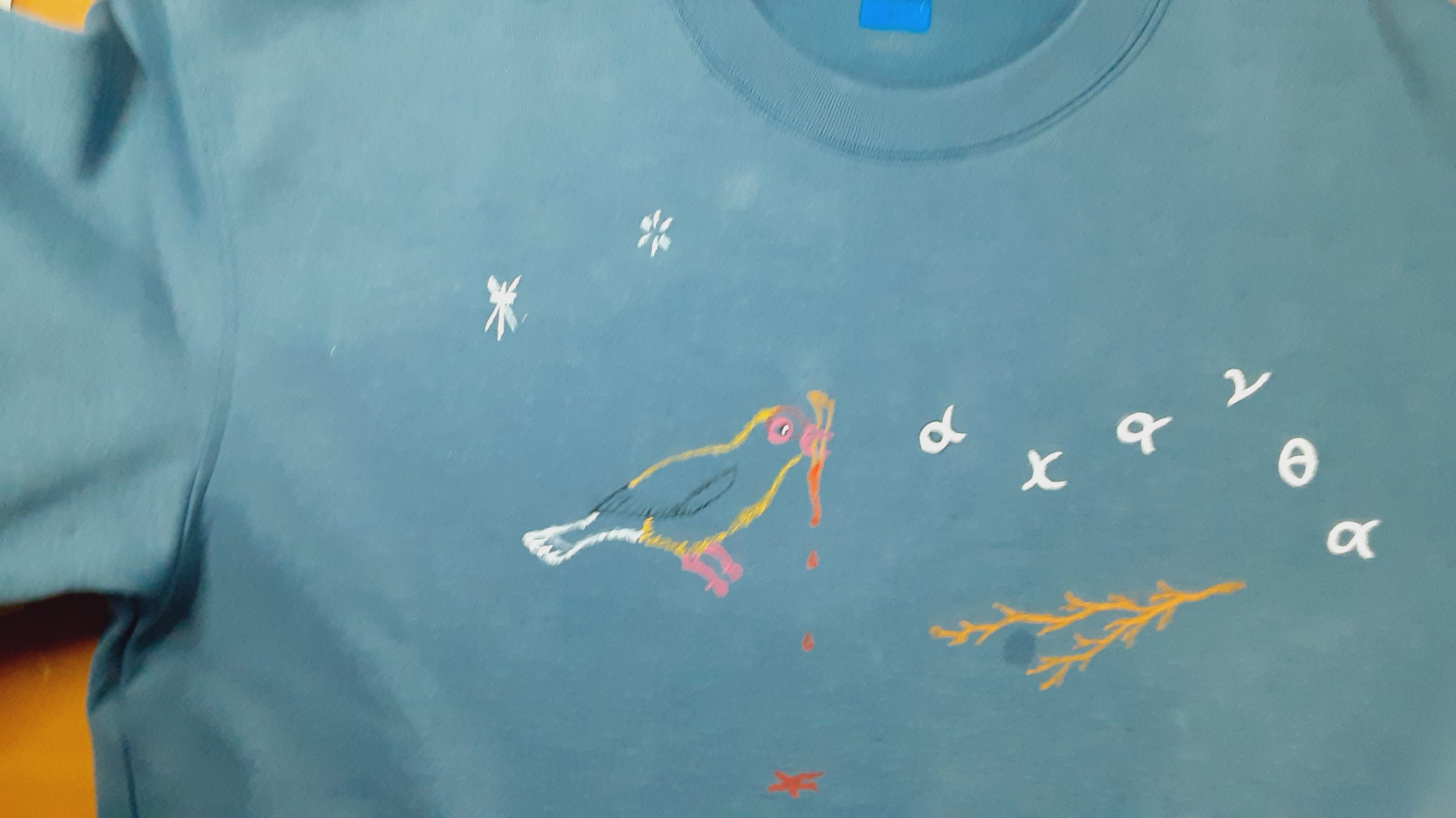 Here, I just began painting a gold finch on a winter shirt.